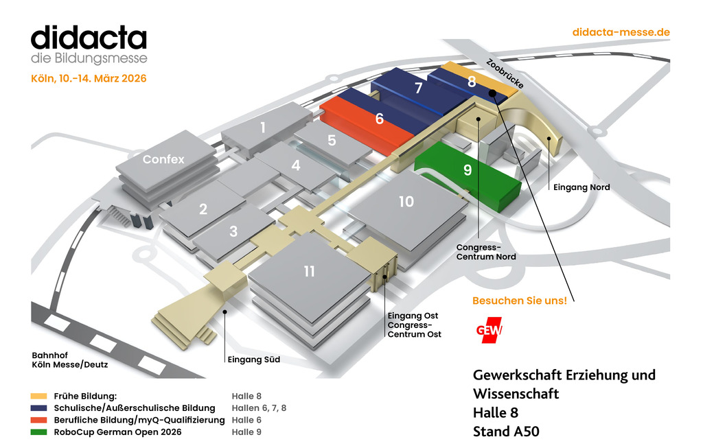 Du bist GEW-Mitglied? Dann kontaktiere jetzt deine GEW-Gliederung für Tickets. Oder kaufe dein Ticket direkt auf der Website der didacta.