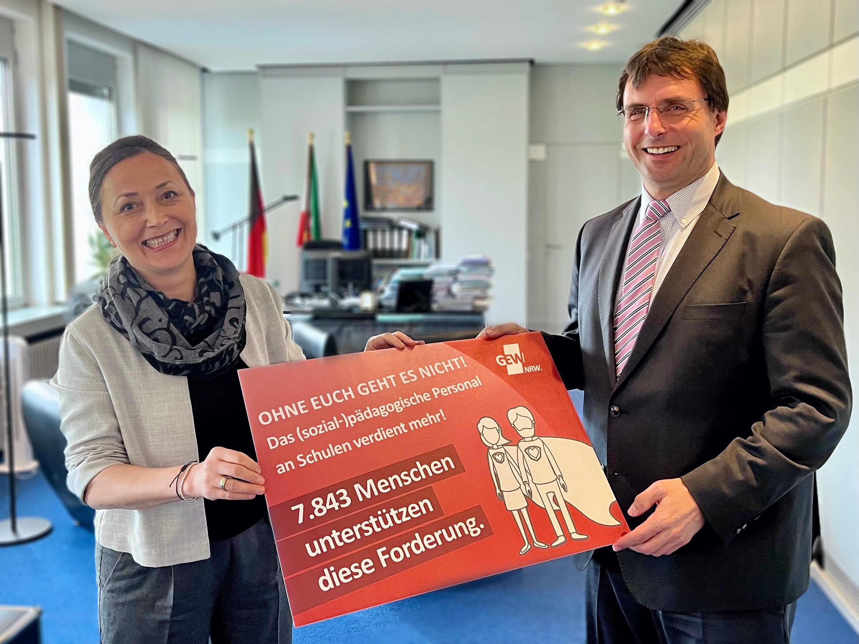 Düsseldorf – Die GEW NRW übergibt am heutigen Donnerstag Finanzminister Dr. Optendrenk eine Petition mit knapp 8.000 Unterschriften. Gegenstand der Petition ist, dass Fachlehrkräfte und Werkstattlehrkräfte an Berufskollegs und Förderschulen, die Schulsozialarbeiter*innen, die sozialpädagogischen Fachkräfte in der Schuleingangsphase und die Fachkräfte in multiprofessionellen Teams (MPT-Kräfte) sowie die Lehrkräfte für den herkunftssprachlichen Unterricht (HSU) im Zuge der Besoldungsreform leer ausgehen. Die Seiteneinsteiger*innen profitieren erst verspätet und erhalten auch keine Zulage.