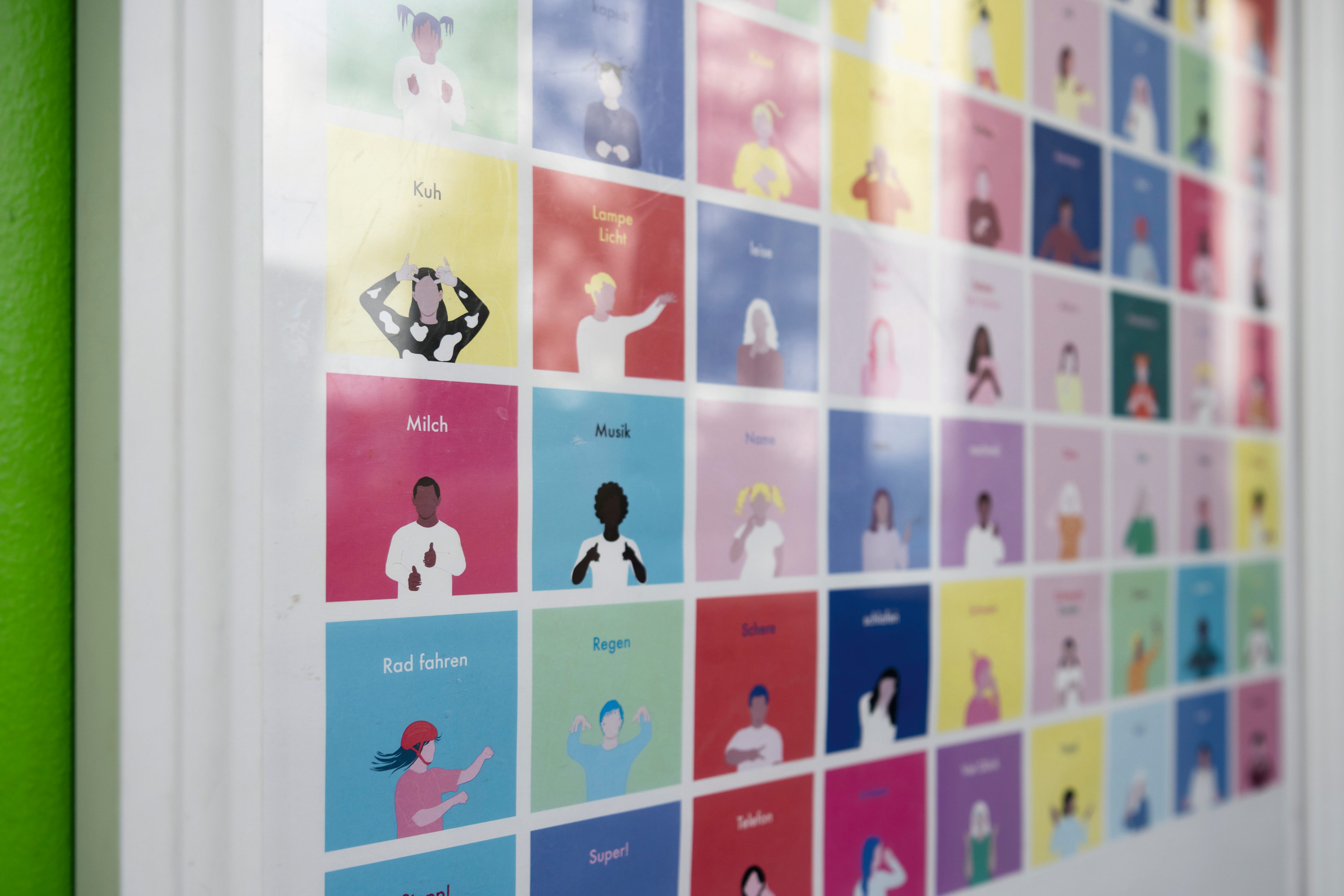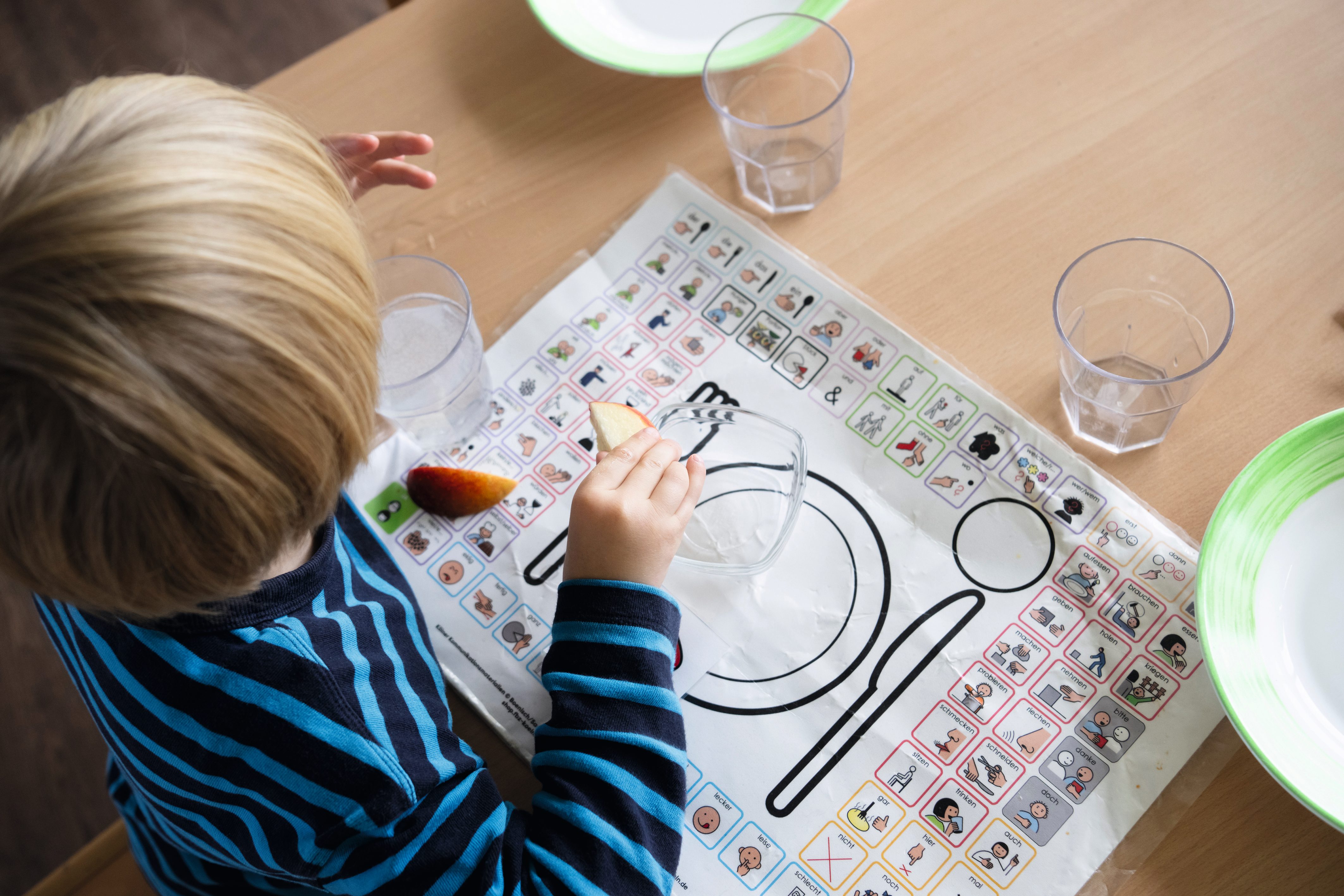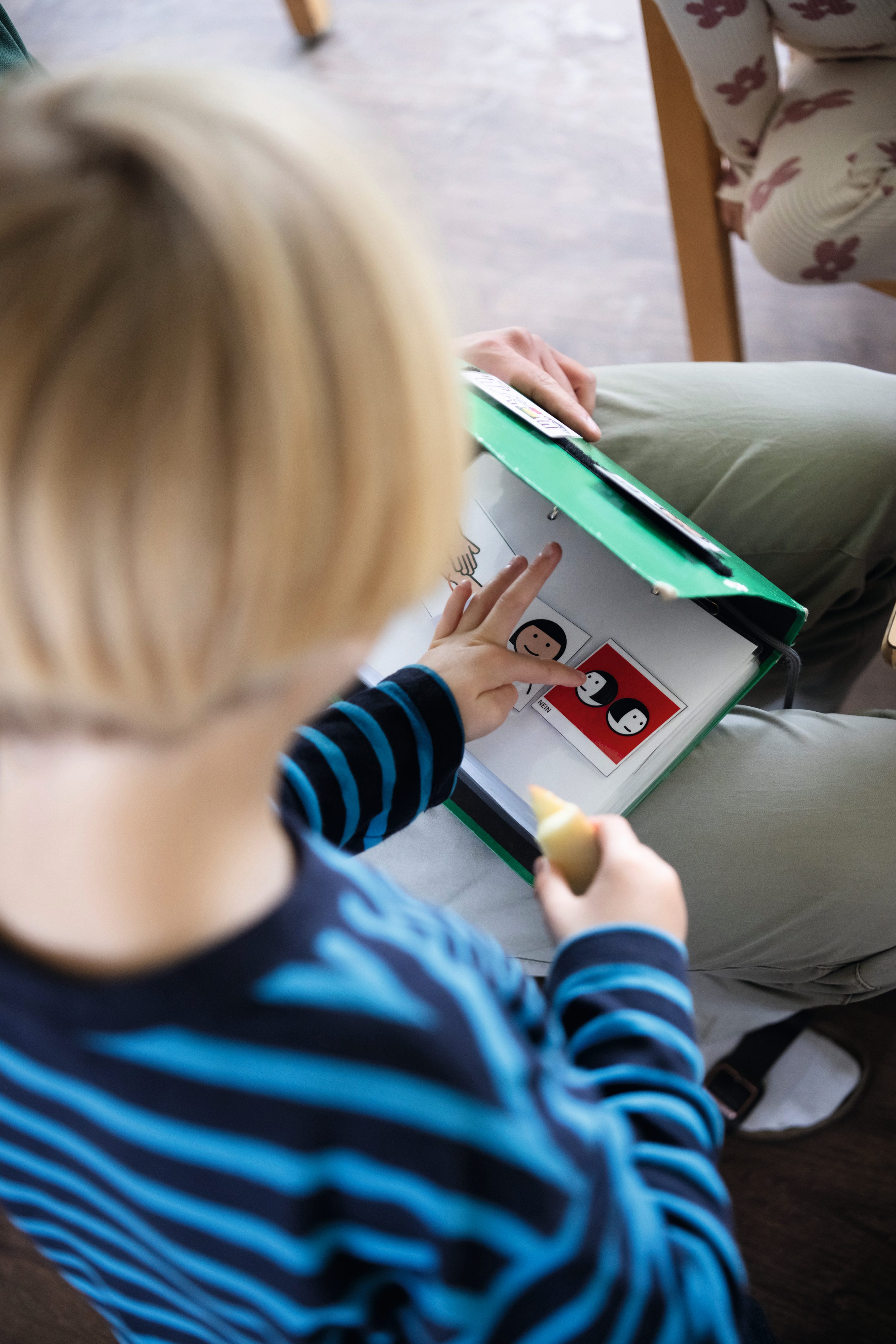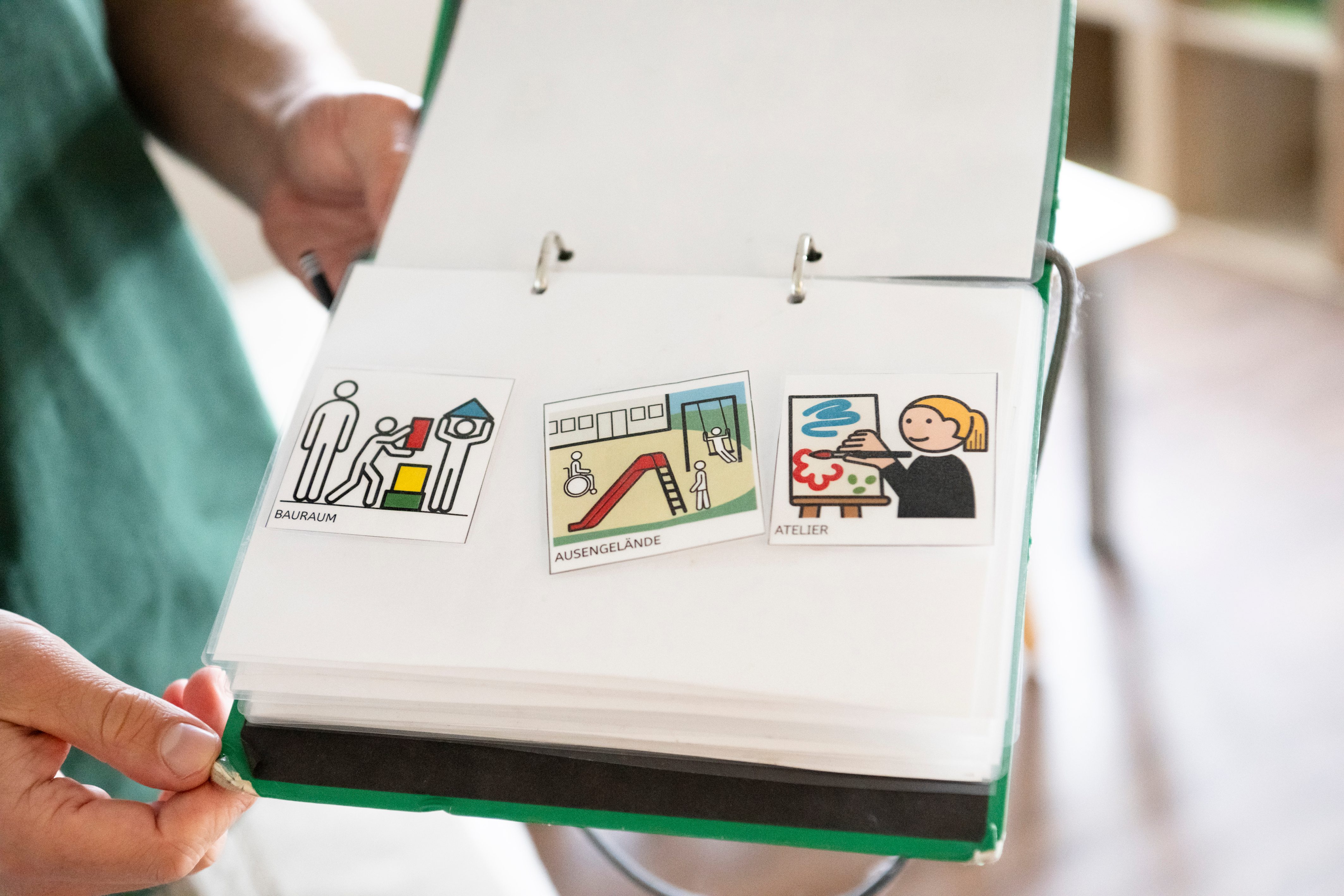 Ob auf großen Tischsets, bunten Wandtafeln oder bei der Gebärde des Monats am Whiteboard – das unterstützende System zum Spracherwerb findet sich visuell in den meisten Räumen der Villa Charlier wieder. Alle Kinder profitieren in ihrem Spracherwerb von den unterstützenden Methoden, die hier täglich vermittelt und eingesetzt werden. Für inklusive Kinder wie Leon sind sie ein Werkzeug, das ihre Kommunikation stark erweitert: „In unserem grünen Buch sind viele Karten, mit denen er mir zum Beispiel sagen kann, was er essen möchte oder in welchem Raum er spielen will. So kann ich viel besser auf ihn eingehen“, erklärt der Heilerziehungspfleger, der Leon den ganzen Tag eng begleitet.