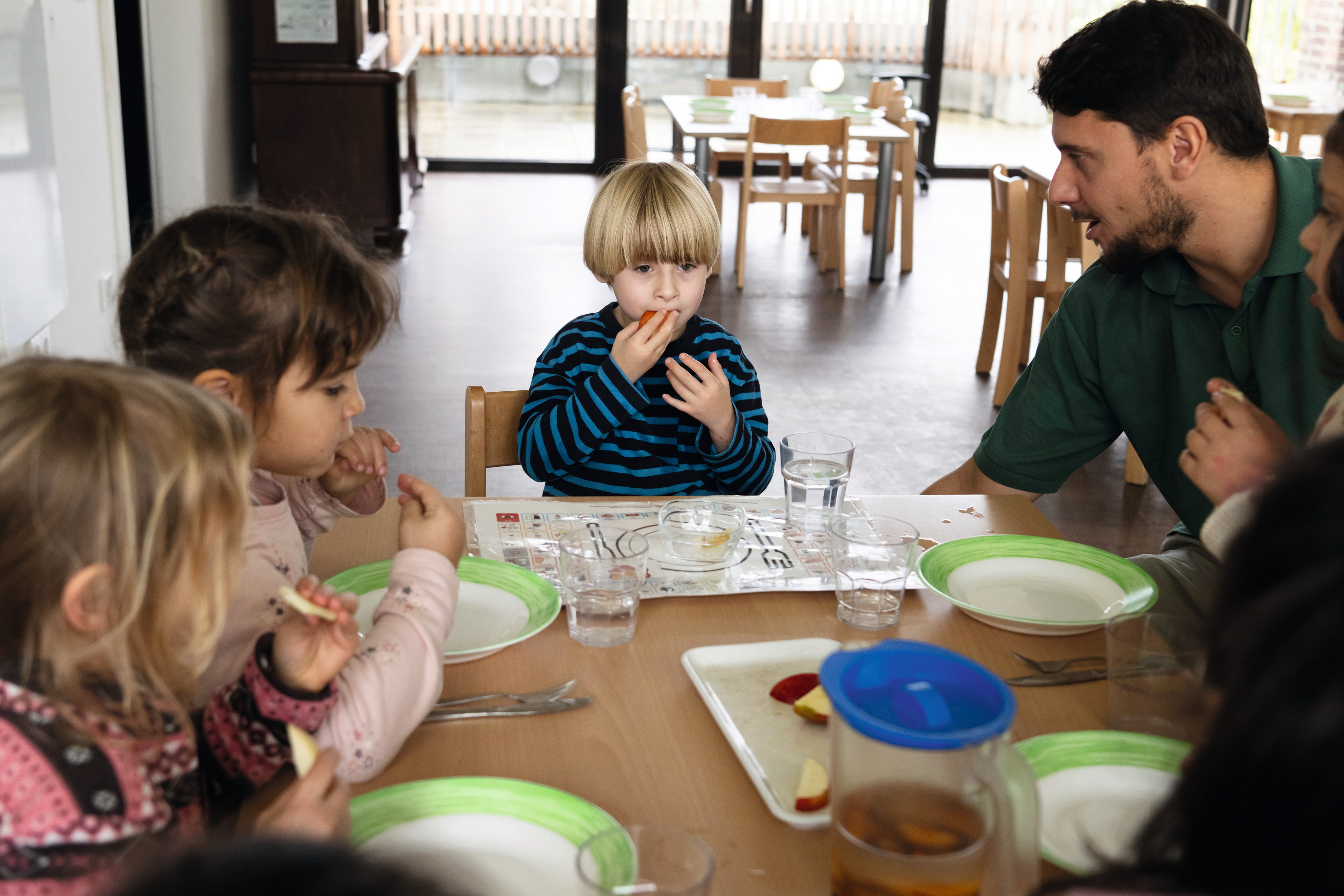 Treppauf, treppab, durch den Flur und ab in die Küche: Der lichtdurchflutete Essensbereich zählt zu Leons Lieblingsorten. „Er kommt morgens zu uns in die Küche, holt sich einen Apfel und schäkert mit uns“, so Küchenkraft Angela Costrau. Gemeinsam mit Heilerziehungspfleger Florian Fritz snackt Leon gemütlich an seinem bevorzugten Platz in der Mitte seiner Freundinnen. Im Gegensatz zu vielen anderen Einrichtungen gehören Heilerziehungspfleger wie Florian Fritz hier zum festen Team: „Ich bin direkt angestellt, das ist für mich, für die Eltern und für die Einrichtung von Vorteil, da viel weniger Fluktuation stattfindet und eine bessere Planung möglich ist.“