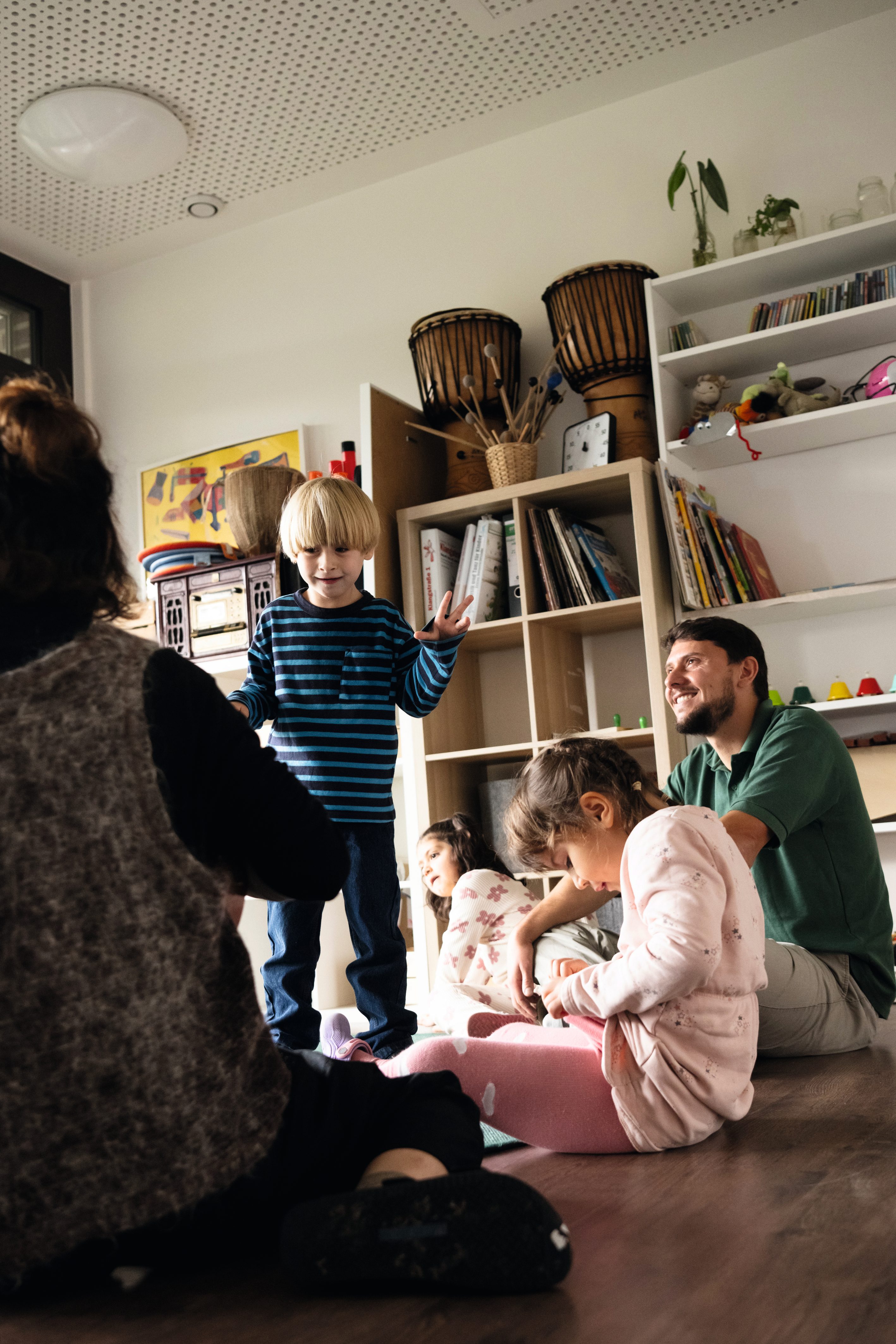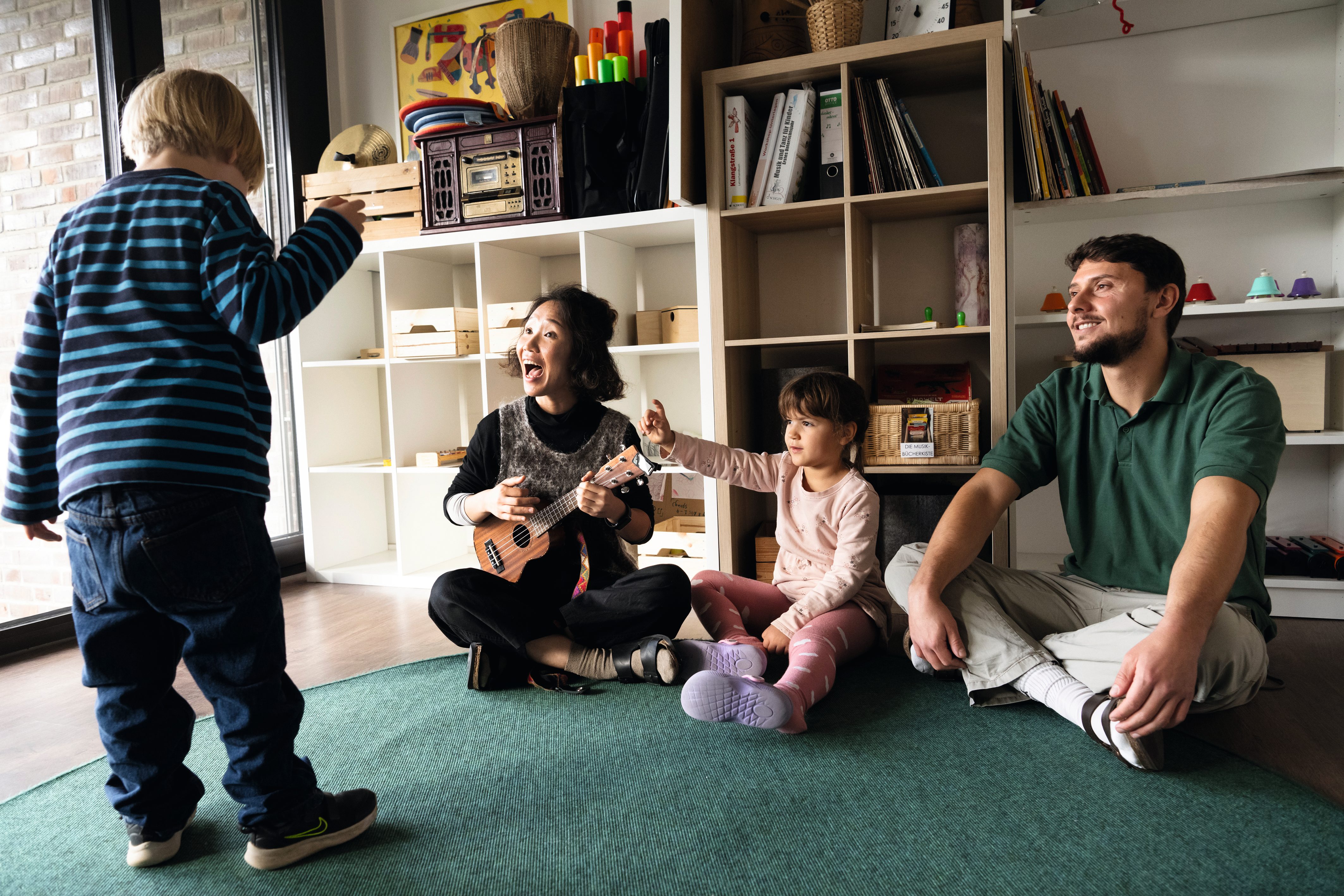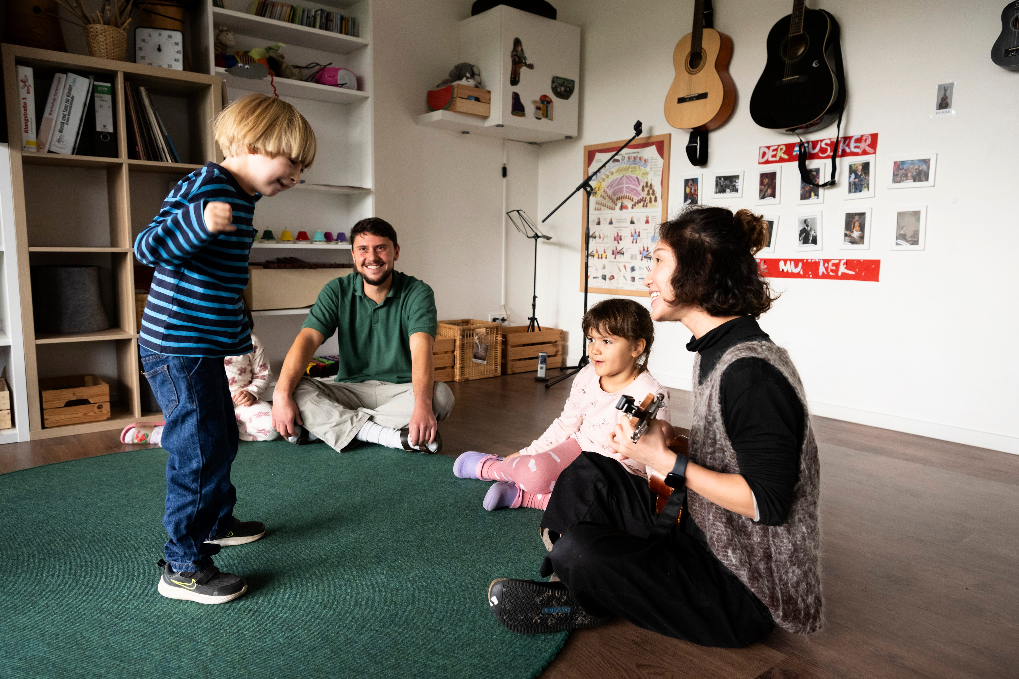 Wer kennt das Lied von den Äpfeln und Bananen? Im großen Musikraum raten die Kinder rund um Erzieherin Mila Li Lieder, während Leon in ihrer Mitte lebhaft tanzt. „Für alle ist es ganz normal, dass er sich viel lieber zur Musik bewegt und nicht so gerne still sitzt. Die Musik erreicht ihn auf eine ganz besondere Weise. Er ist jedes Mal aufs Neue mit ganzem Herzen dabei“, erzählt die Erzieherin.