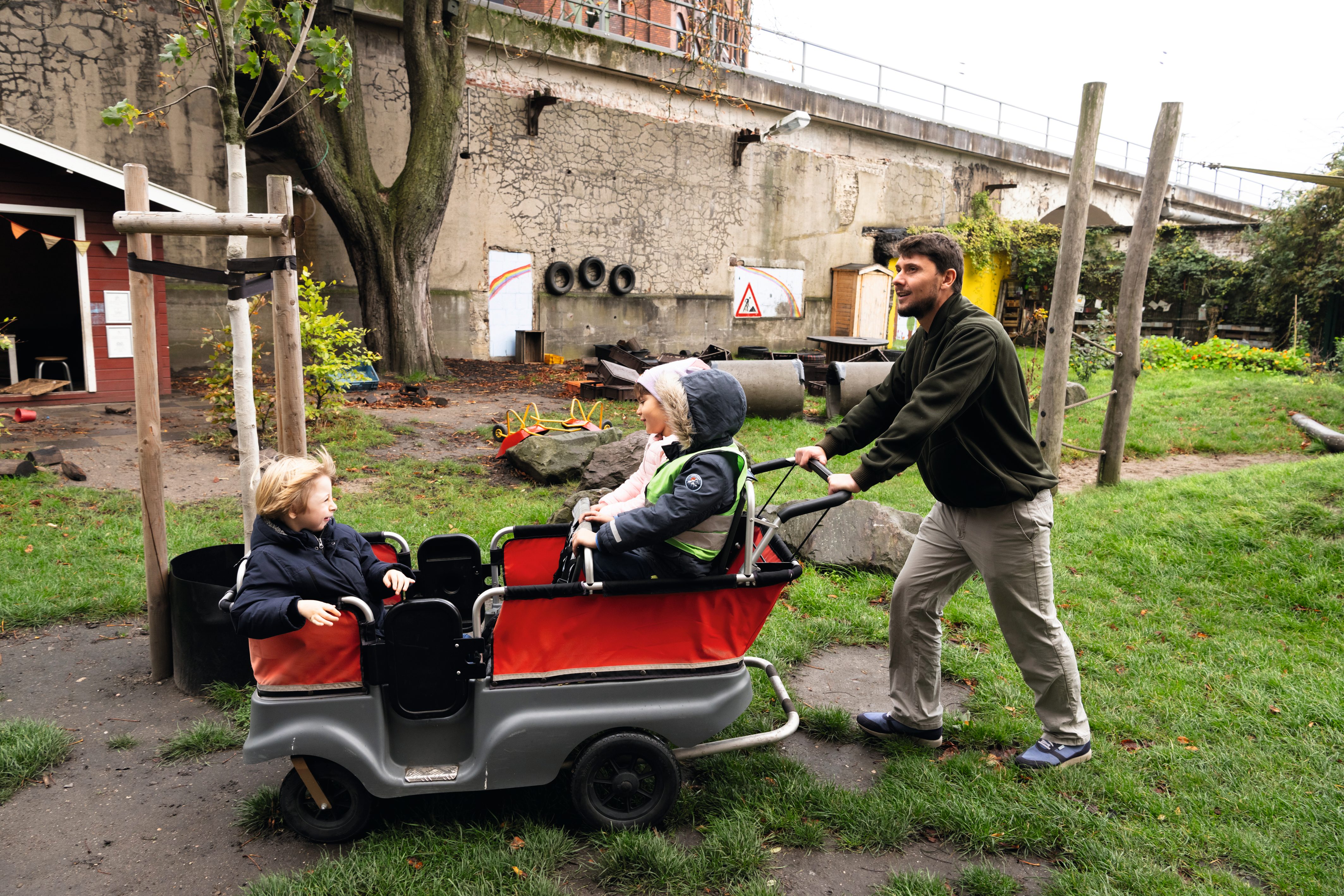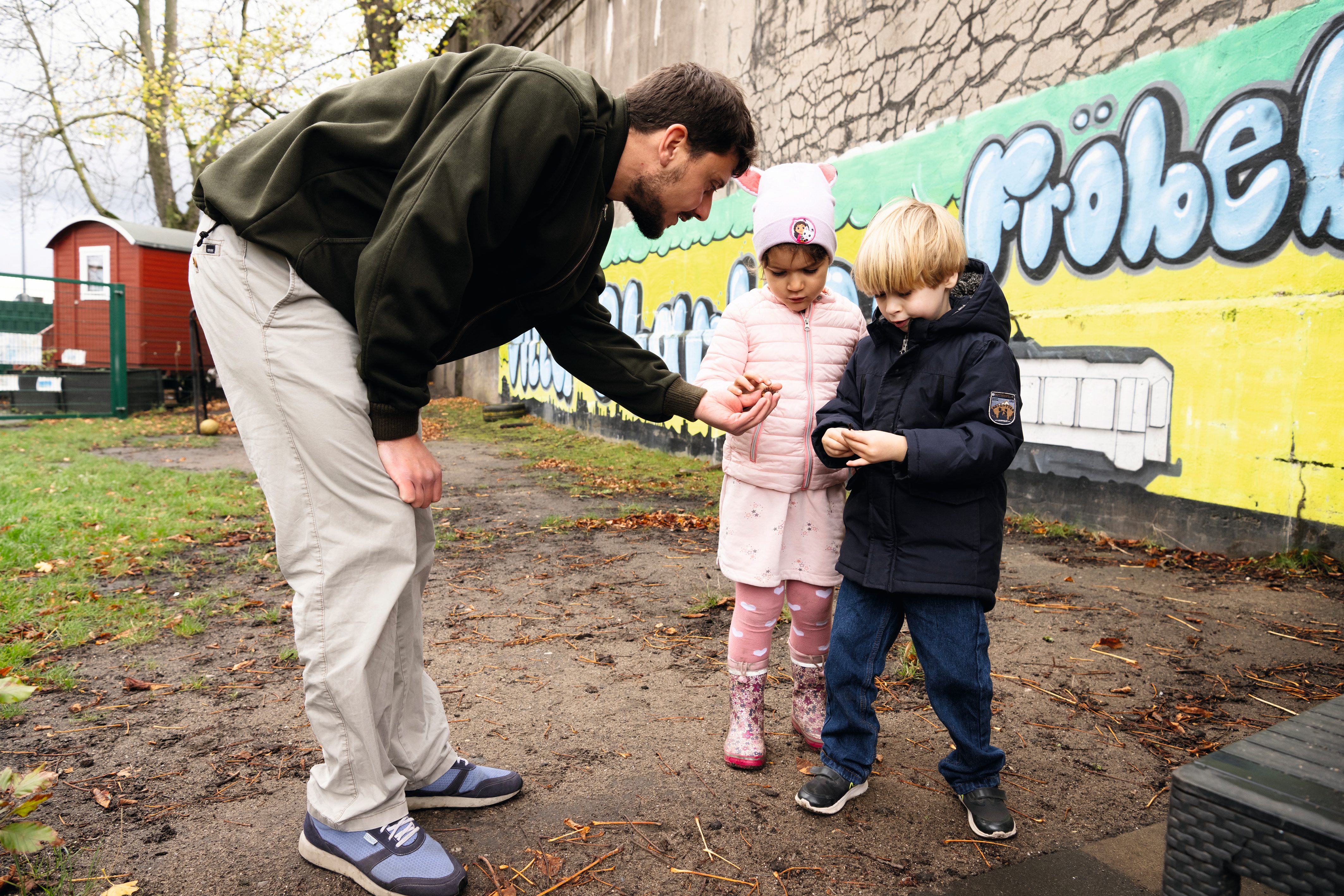 Im weitläufigen Außenbereich gibt es viele unterschiedlich gestaltete Stationen für alle Entdecker*innen. Würmer und Insekten anschauen, im Matsch toben oder sich einfach mal bei der Fahrt mit dem Kitawagen den Wind durch die Haare wehen lassen. Eine feste Draußenzeit gibt es nicht. Es ist Bestandteil des offenen Konzepts, dass die Kinder nach draußen können, wenn sie es möchten.