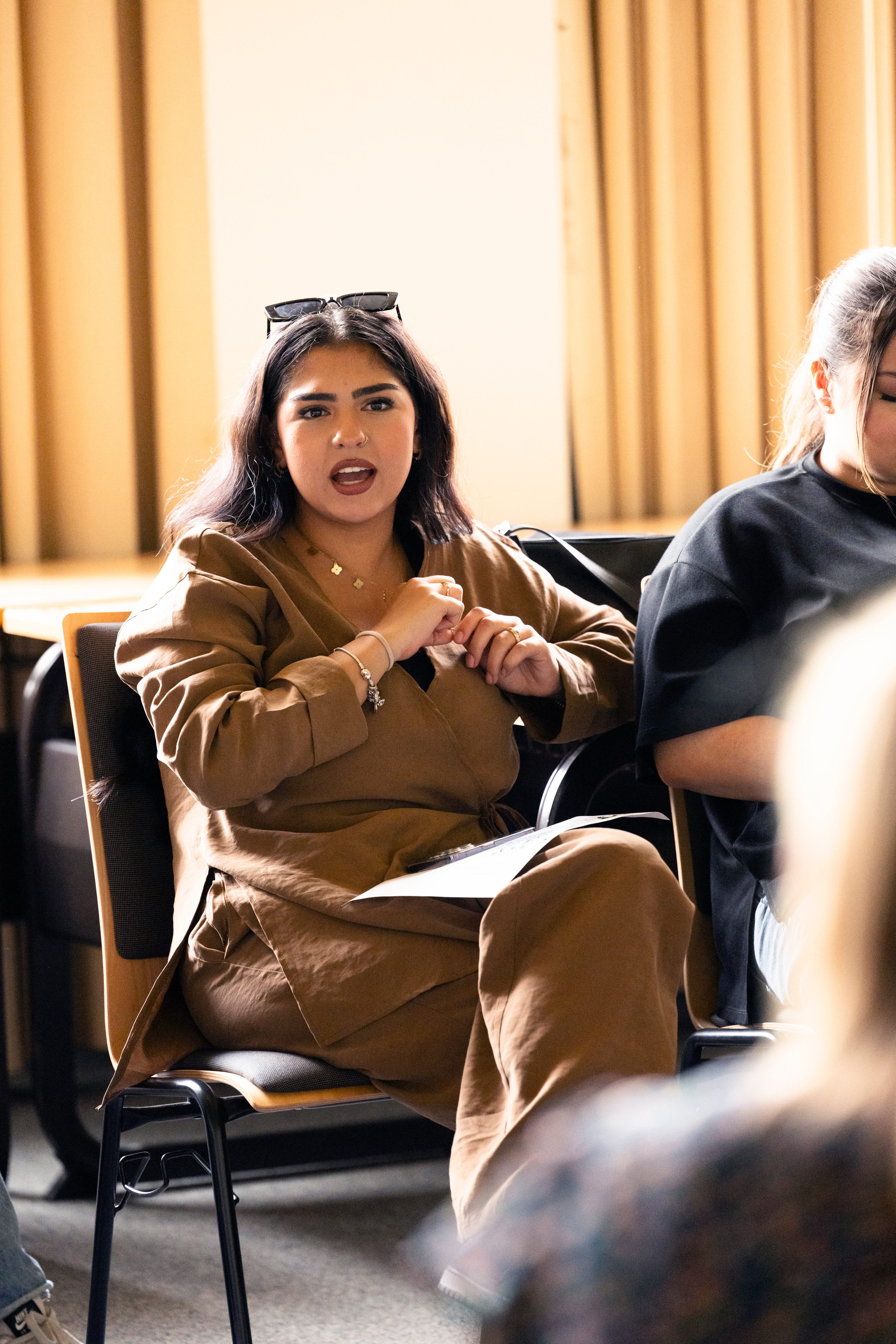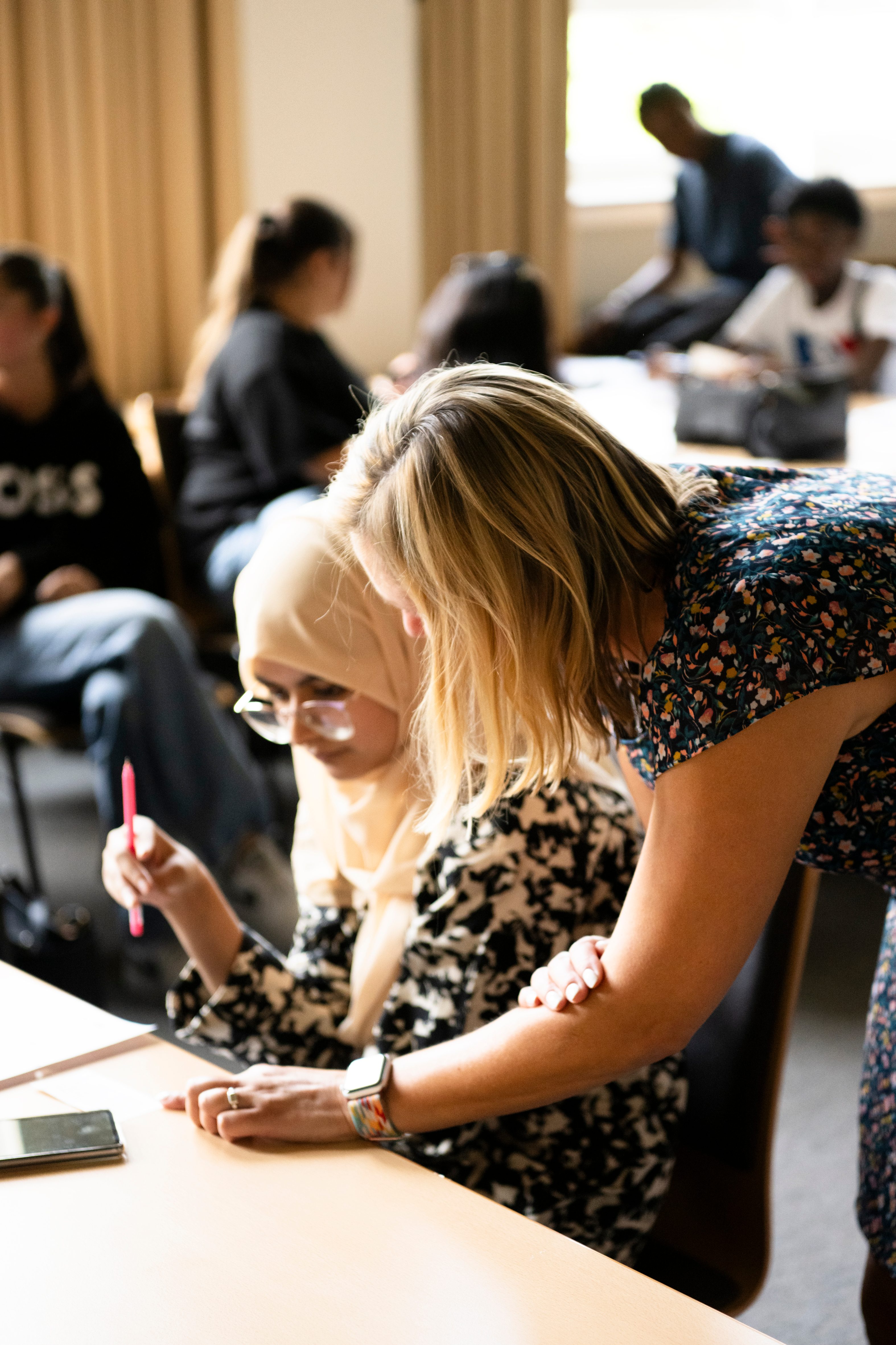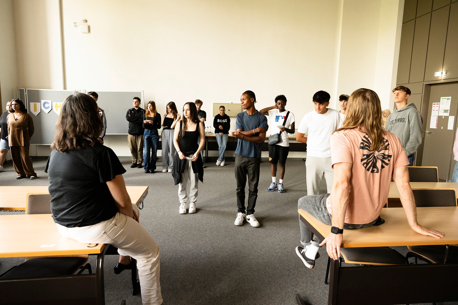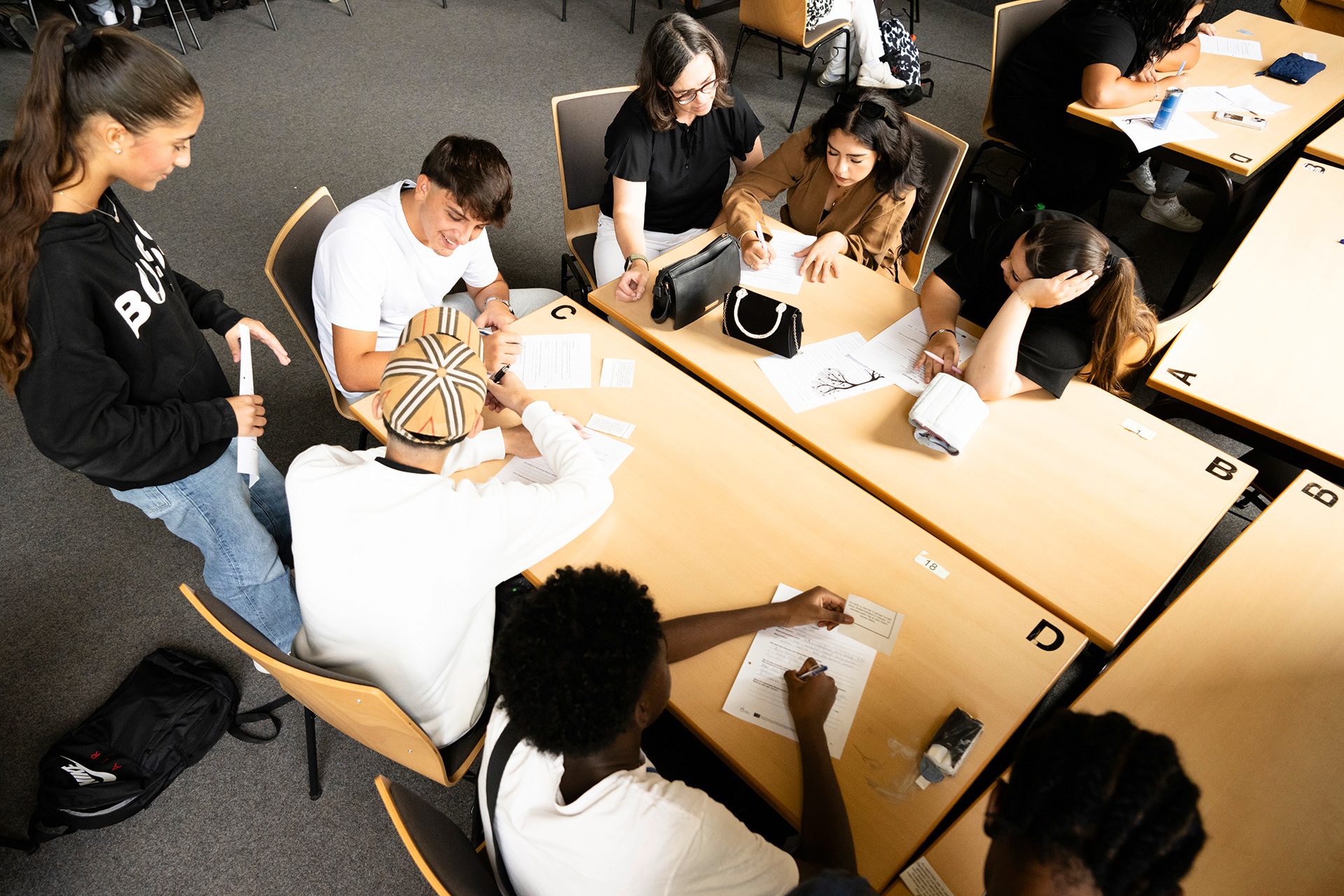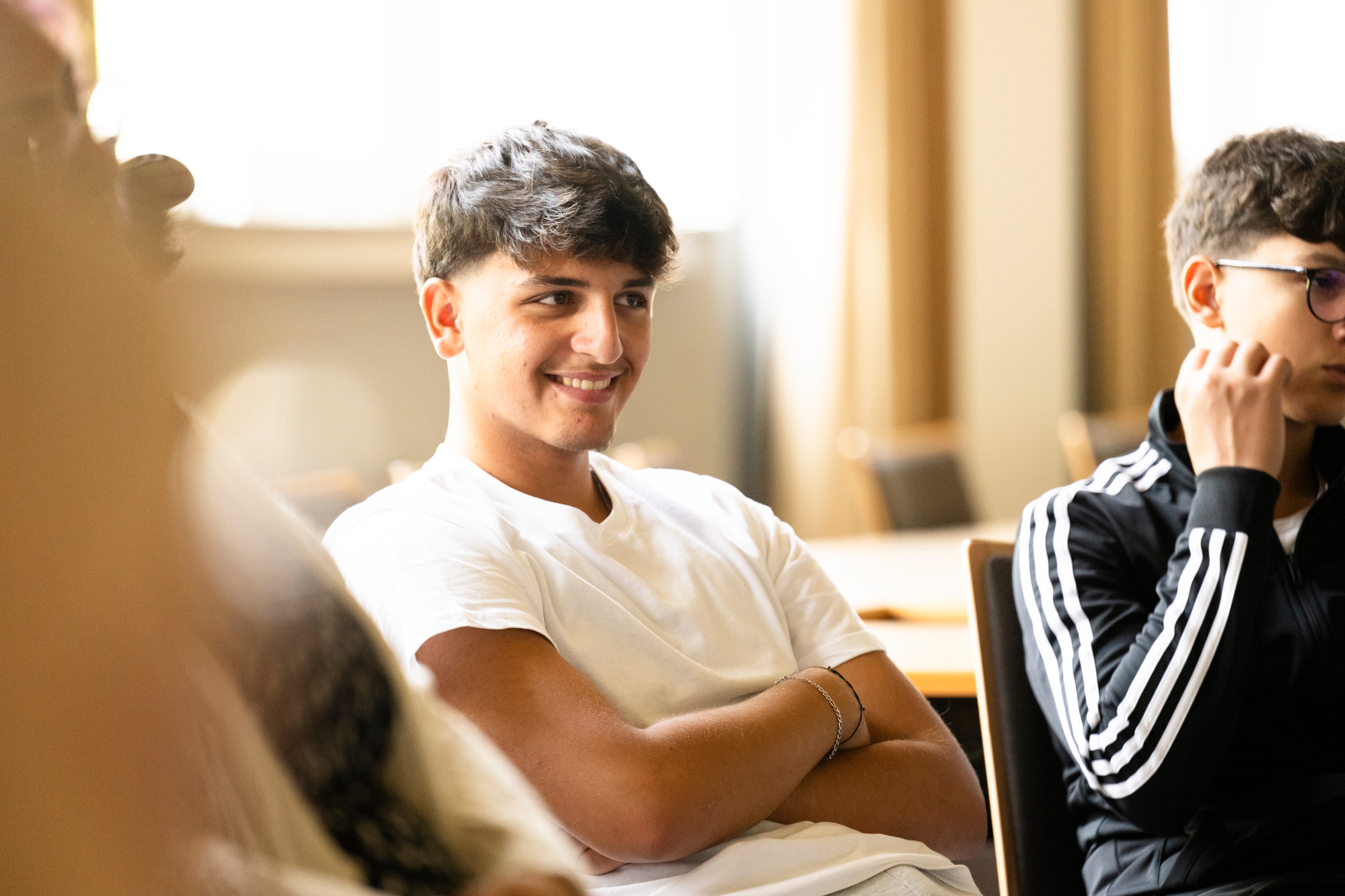 Sich seiner Stärken bewusst sein, an sich glauben, Ziele verfolgen: Melanie* lässt keinen Zweifel daran, worauf es im Leben ankommt. „Man sollte die eigenen Schwächen nicht zu sehr in den Vordergrund rücken“, sagt die 37-Jährige und blickt ermutigend in die Runde. Die Islamwissenschaftlerin ist umringt von Jugendlichen. 21 Schüler*innen haben sich im Stuhlkreis um sie herum platziert und hören aufmerksam zu. In der Aula des Robert-Schmidt-Berufskollegs geht es an diesem Donnerstag um Identität – ein zentraler Bestandteil der Einführungswoche, die die 16- bis 18-Jährigen zum Start in die Höhere Handelsschule absolvieren.
